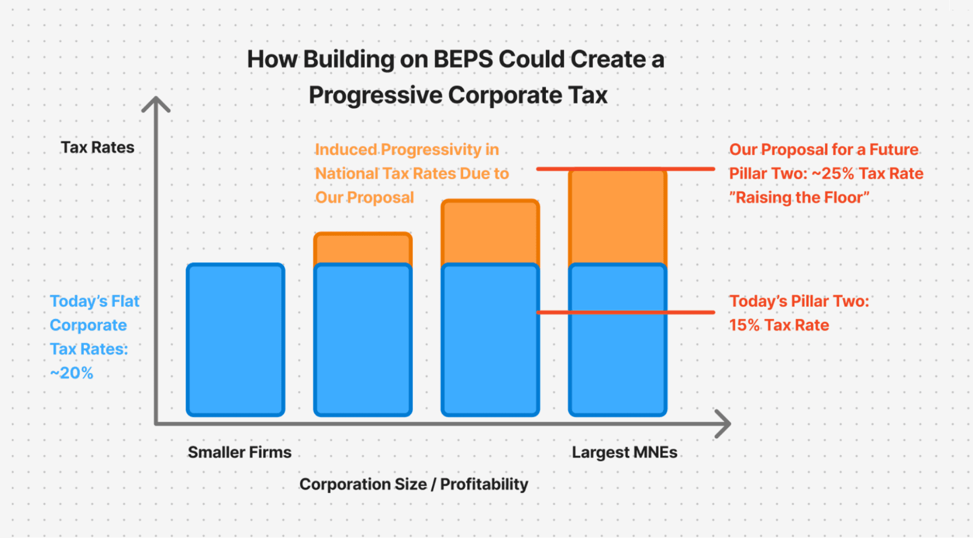 Eventually, the tax rates on these top performers would surpass the corporate tax rates of individual countries. In practice, this would result in a progressive corporate tax. Smaller, less profitable companies would be taxed according to a local (national level) set of regulations. The larger, profitable global firms would be taxed more, according to rules set globally by the BEPS Inclusive Framework.